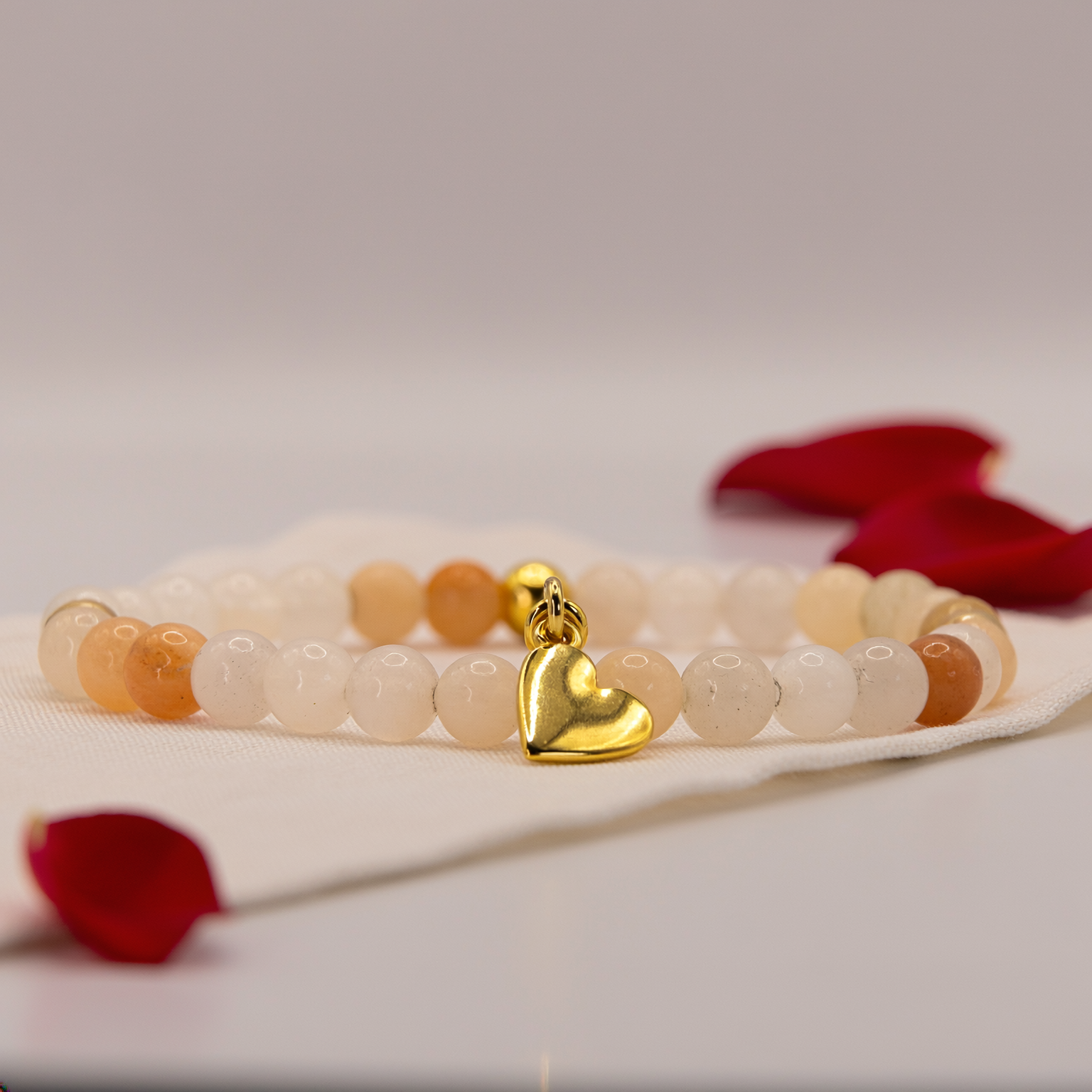 De armband is elegant afgewerkt met 6mm natuurlijke edelstenen, Designer Quality gouden kralen en een liefdevolle hart-bedel – een tijdloos symbool van verbondenheid.