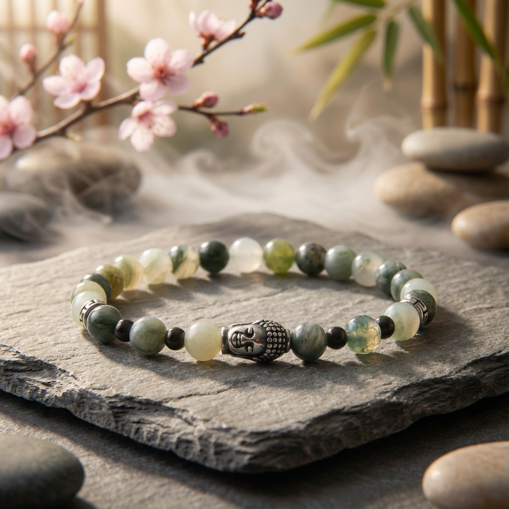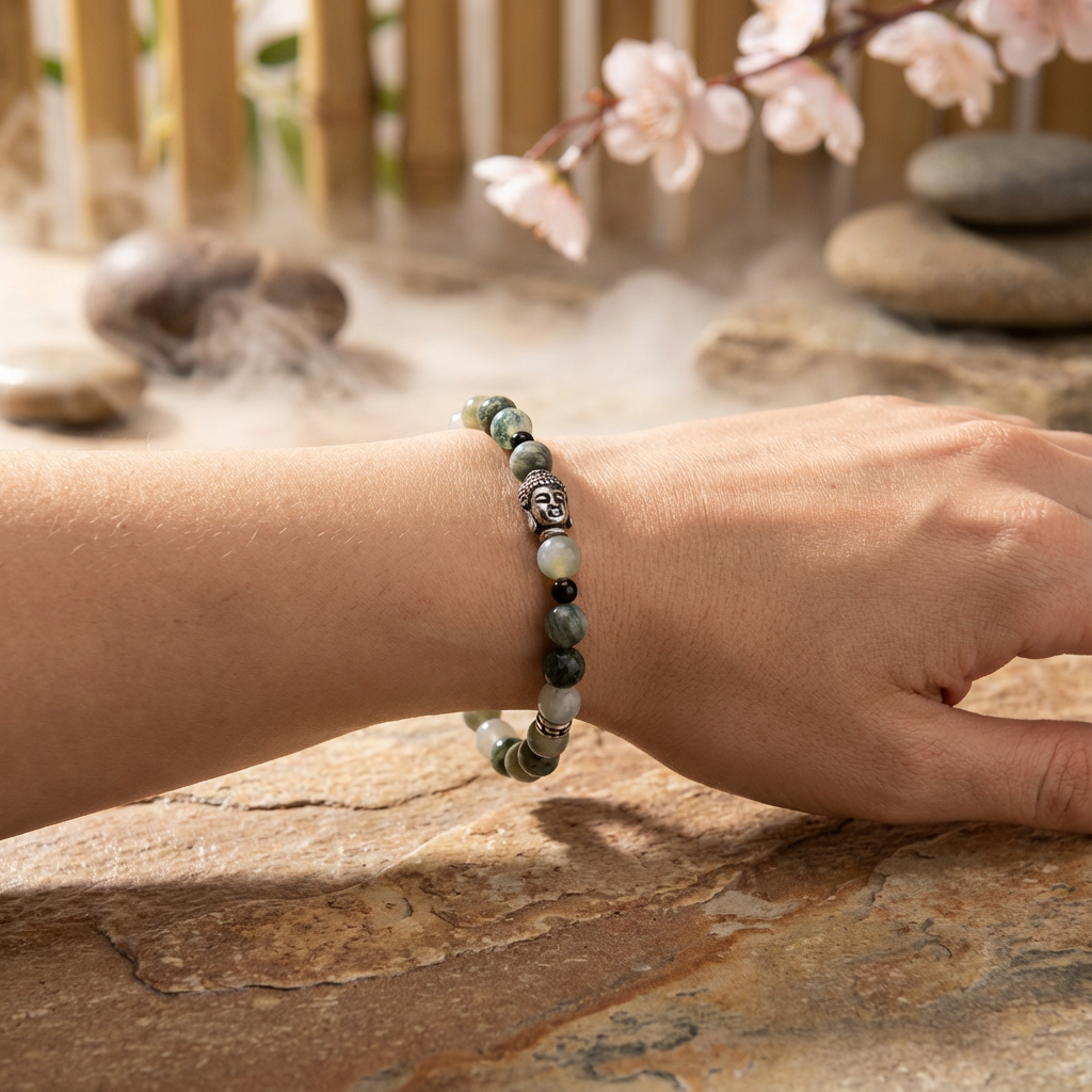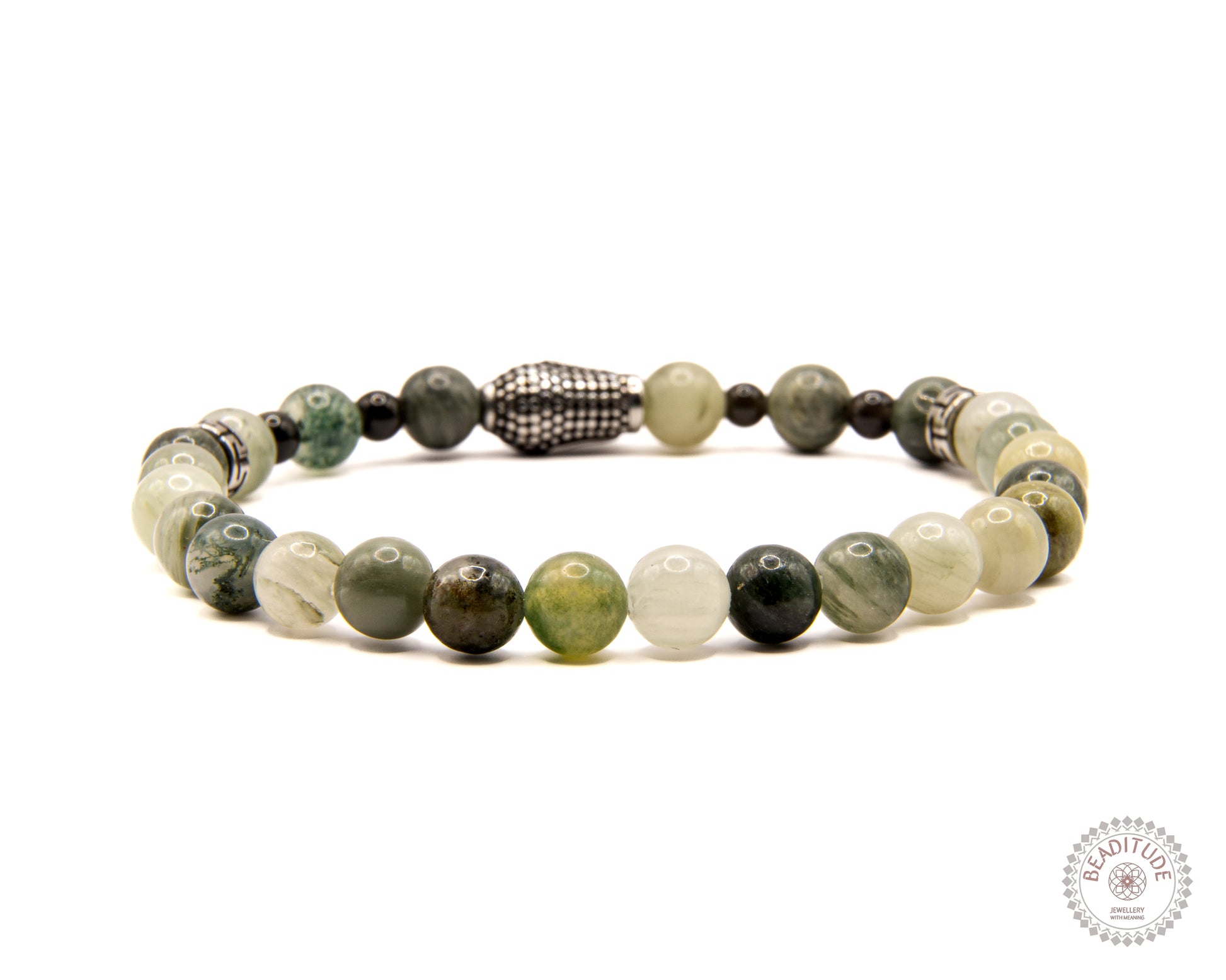 Mosagaat heeft een fijne aardende werking en heeft een zachte energie, zet je in het hier en nu en zorgt voor stabiliteit en balans. De rustgevende en ontspannende werking van Mosagaat laat gedachten tot rust komen, helpt ook sterk wisselende stemmingen af te vlakken en vergroot je zelfbeheersing doordat het spanningen relativeert.
